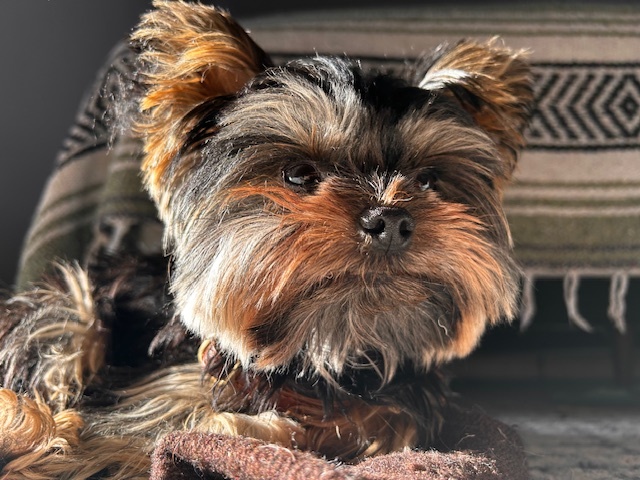 Hello, my name is Dude. I have many nicknames, but my most used is Laa Laa Dude, Dudester, or The Dude. I'm a Yorkshire Terrier, and I am two years old. I am an angel (sometimes), but if I pee on Moms rug—that's when I get a talking to, and I pretend to understand. I can do some tricks like sit, lay and play ball. My biggest fear is the dreaded vacuum cleaner! All my neighbors know me when I go on walks. I bark when I see a squirrel or a bird because they’re the only animals smaller than me, and all the other dogs probably get annoyed, but I’m ok with that.