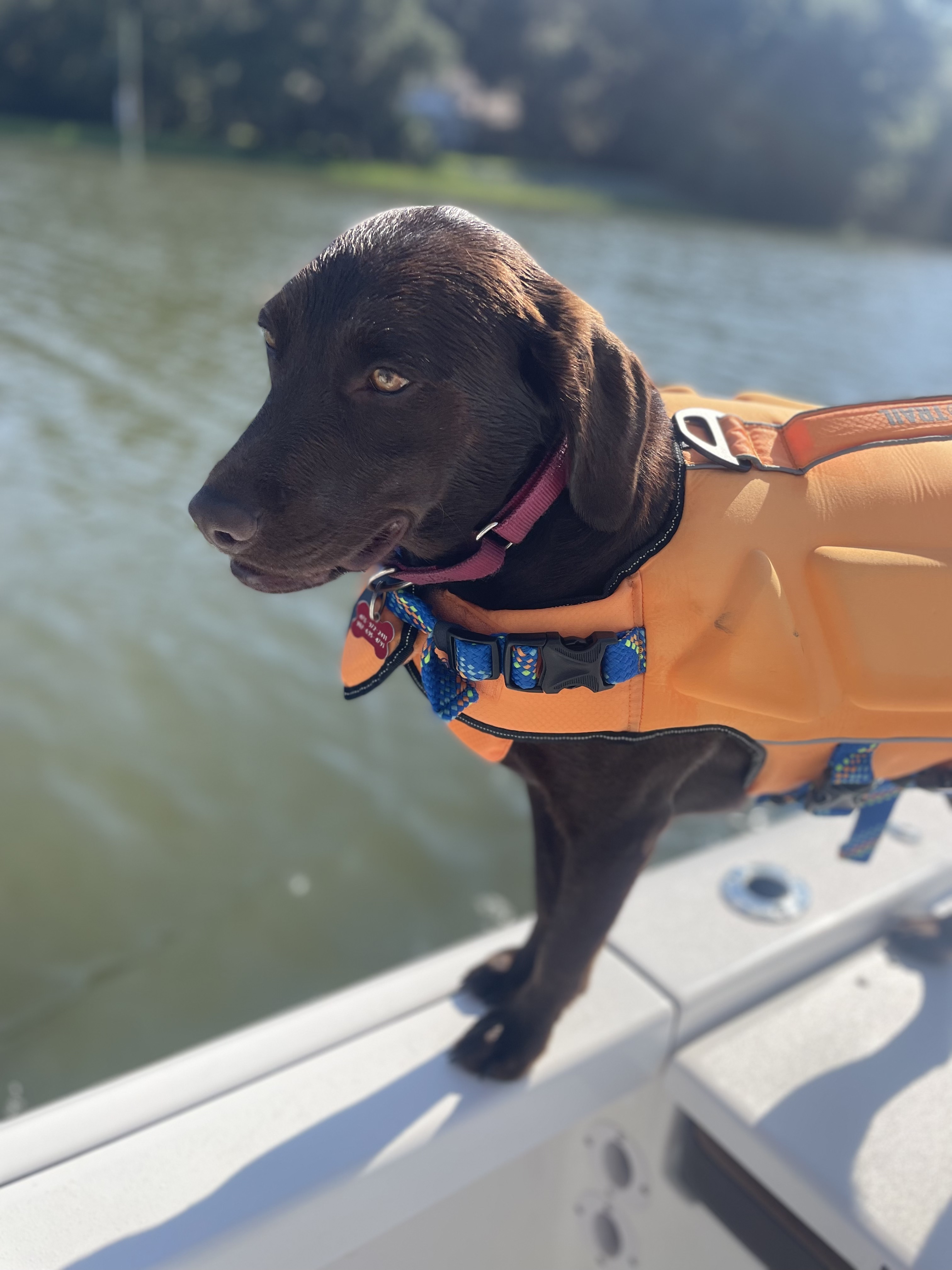 Despite her petite size, Diddle lives large. She prefers to be cradled like a baby — even on boat rides — and will launch herself into the river in any season. While she happily destroys most toys, she shines in the water, swimming confidently, whether along the Bluff or at the beach.